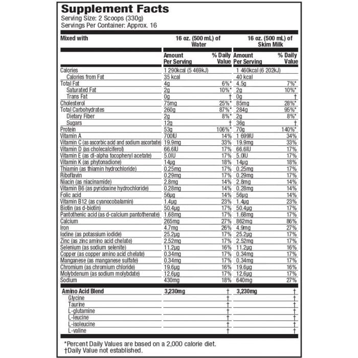 100% Premium Mass Gainer vă ajută să vă satisfaceți nevoile calorice prin furnizarea numărului masiv de 1270 de calorii, inclusiv 50 de grame de proteine de înaltă calitate și 261 de grame de carbohidrați pentru furnizarea de energie în fiecare porție. Acesta conține vitamine esențiale, minerale, un spectru complet de aminoacizi, care ajută la construirea masei și puterii musculare.