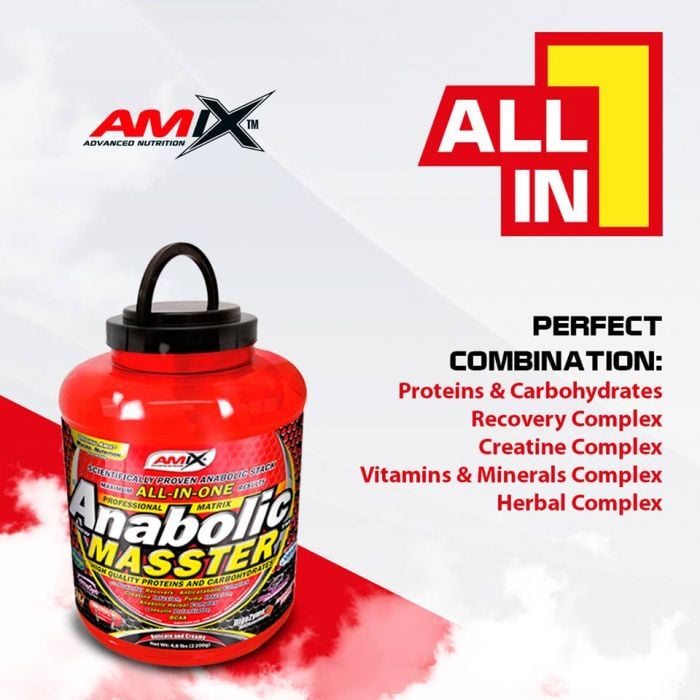 Anabolic Masster se numără printre amestecurile all-in-one eficiente de înaltă calitate pentru susținerea maximă a rezultatelor antrenamentului. Conține multe proteine, în special sub formă de concentrat, izolat de zer, proteine din ouă și hidrolizat (aminoacizi derivați din proteinele de vită). Prin urmare susține dezvoltarea și menținerea masei musculare, precum și sănătatea oaselor. În plus, include carbohidrați care ajută la regenerarea și refacerea surselor de energie epuizate (glicogen). Următorul ingredient este HMB, un metabolit leucină care are legătură cu stimularea producției de proteine musculare noi (MPS - sinteza proteinelor musculare). L-arginina, un precursor al oxidului nitric, este și ea prezentă în lista ingredientelor. Are un impact circulației sanguine a organismului în general, care ajută mușchii să primească mai mult oxigen și nutrienți sănătoși. Drept urmare, acest lucru poate ajuta cu o regenerare îmbunătățită sau o performanță sportivă mai eficientă.