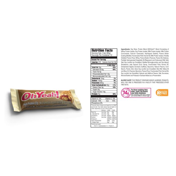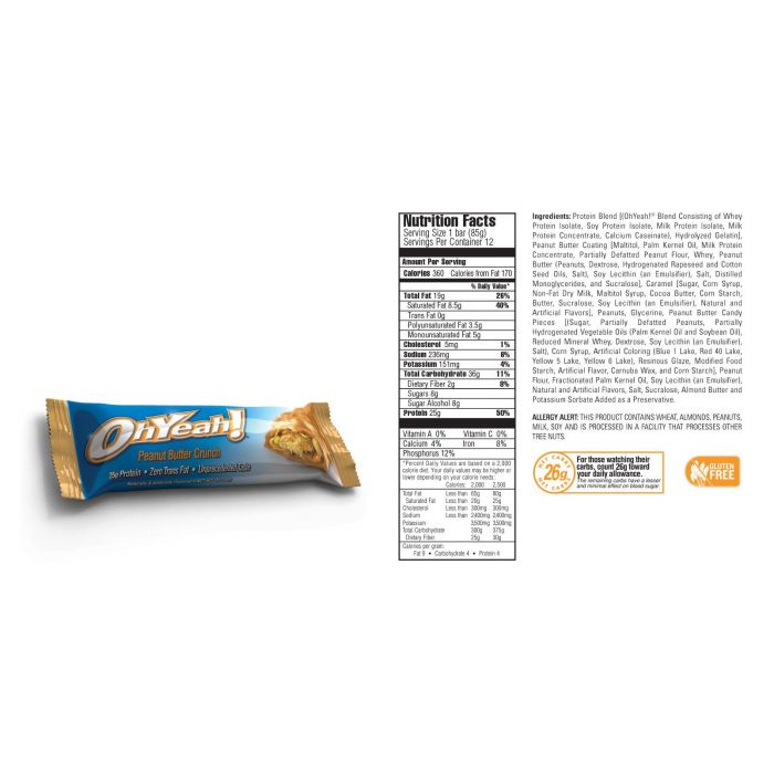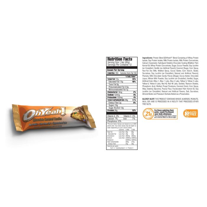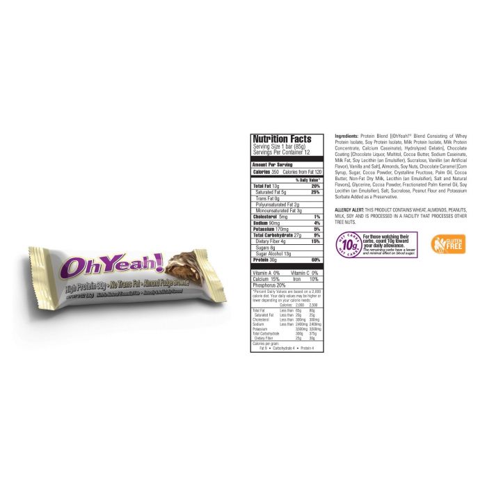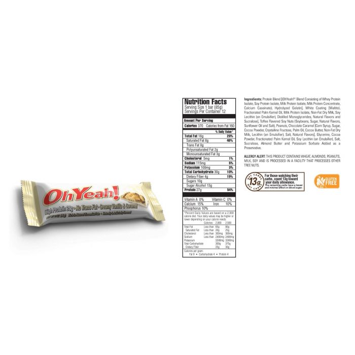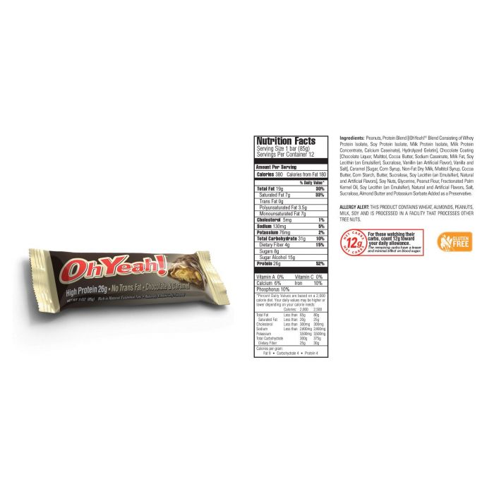 Batonul proteic Oh Yeah se remarcă printr-un gust inegalabil şi un conţinut de 30 g de proteine de calitate, grăsimi benefice (CLA, EFA), conţinut scăzut de zahăr şi fără grăsimi trans! Acest baton fără gluten este fabricat din ingrediente de calitate superioară cu bucăţi de alune glazurate în caramel şi ciocolată cu lapte! Este absolut delicios şi nutritiv.