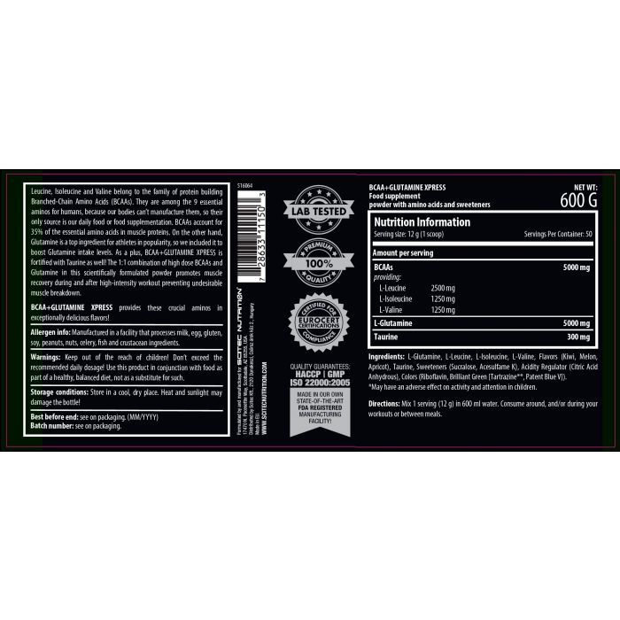 BCAA + Glutamine Xpress este combinația perfectă dintre aminoacizii glutamină și aminoacizii cu lanț ramificat - leucina, izoleucina și valina(adică BCAA), în raport de 1:1, fiind cei mai importanți aminoacizi pentru creșterea și regenerarea masei musculare. În plus, produsul este îmbogățit și cu taurină, pentru a reduce oboseala și epuizarea musculară.