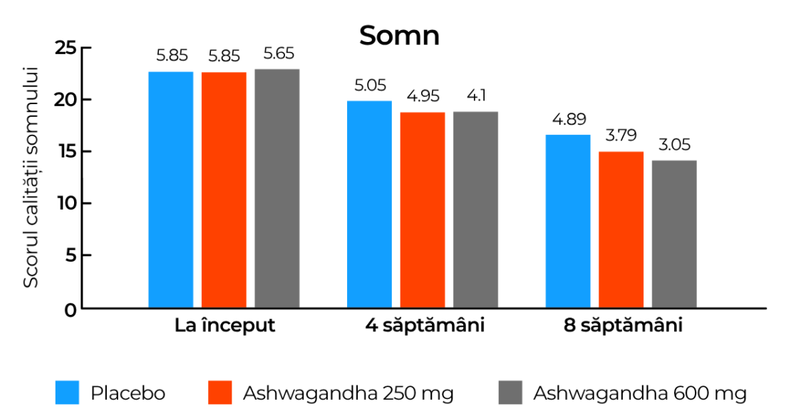 Participanții au evaluat calitatea somnului lor pe o scară de la 1 la 7, unde cea mai mică valoare a indicat cea mai bună calitate a somnului, iar cea mai mare valoare a reprezentat o calitate slabă a somnului. După opt săptămâni, s-a dezvăluit că în grupurile care au consumat ashwagandha calitatea somnului s-a îmbunătățit. Îmbunătățirea a fost mai semnificativă la grupul care a consumat 600 mg de extract, comparativ cu grupul care a primit o doză de 250 mg. [16]
