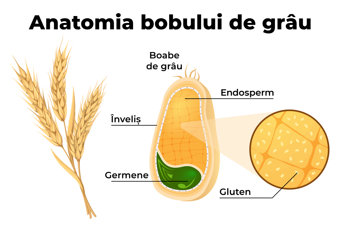 - Gluten: Proteina care se găsește în endosperm, alcătuită din gliadină și glutenină, care conferă aluatului elasticitatea și textura moale și aerisită.