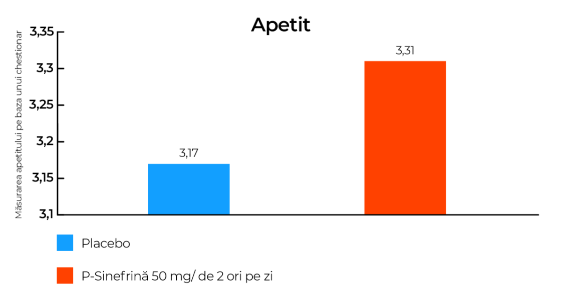 Legătura dintre sinefrină și controlul apetitului a fost evidentă într-un studiu care a inclus 40 de persoane și care a durat 30 de zile. Participanții au fost împărțiți în patru grupuri și au fost rugați să consume acadele gumate zilnic timp de o lună, cu 15-30 minute înainte de două dintre cele mai mari mese principale ale zilei. Grupul A a primit acadele care conțineau 50 mg de p-sinefrină (deci au primit 100 mg zilnic), iar Grupul B a consumat un placebo, o acadea obișnuită fără ingredientul activ. Grupurile A/B și B/A au primit o variantă a acadelelor timp de jumătate de lună, iar apoi cealaltă variantă. [2]