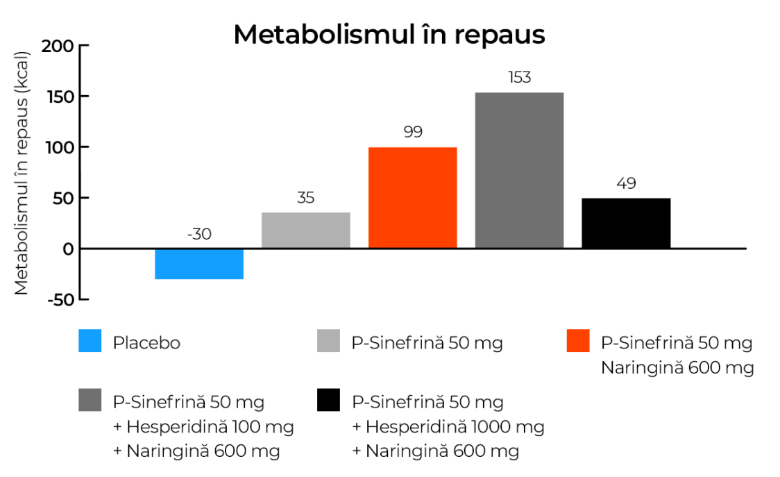 S-a demonstrat că folosirea p-sinefrinei poate crește rata metabolismului bazal în comparație cu un placebo, cu aproximativ 6.9% (în jur de 65 kcal). Totuși, o creștere și mai mare a apărut după administrarea combinației cu naringină. Cea mai mare creștere a apărut odată cu combinarea cu naringină și hesperidină. Totuși, o doză de 1000 mg de hesperidină nu a avut un efect așa de mare. [7]