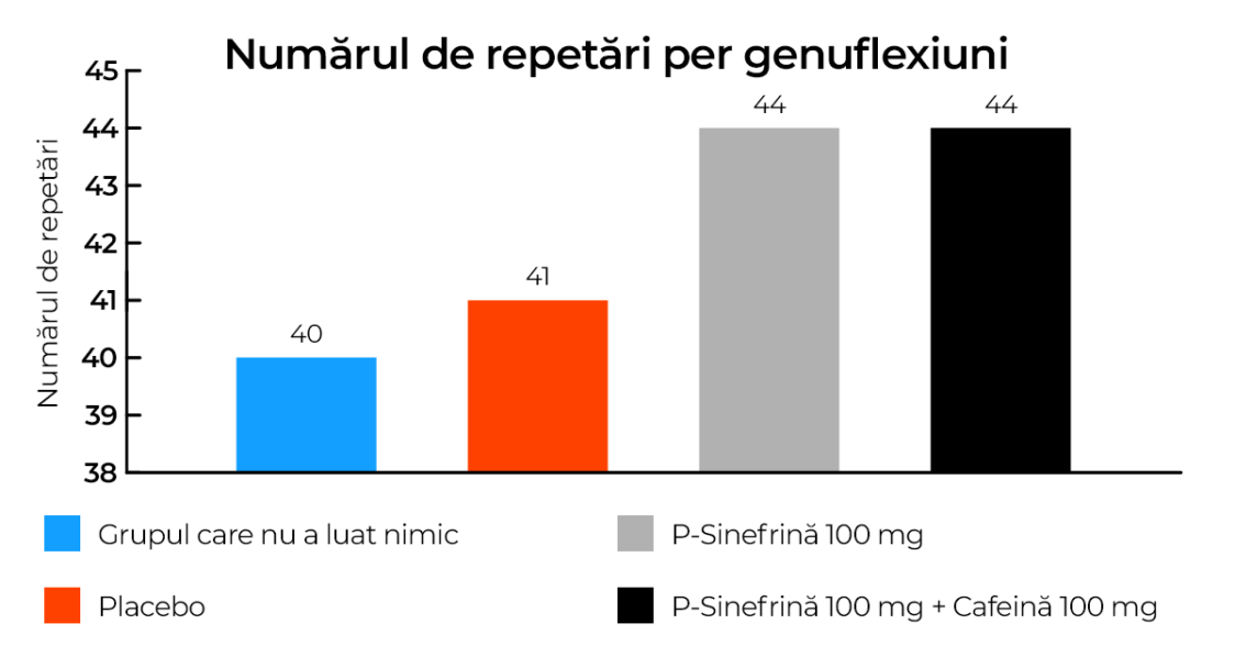 Oamenii de știință au cercetat efectul administrării acestor substanțe asupra performanței de forță, mai exact numărul de repetiții pe genuflexiune. Protocolul experimental a constat în 6 seturi de genuflexiuni cu până la 10 repetări pe set cu o greutate de 80% din greutatea maximă. Intervalul dintre seturi a fost de 2 minute. S-a constatat că participanții din grupurile care au primit sinefrină și sinefrină cu cafeină au atins în medie un număr mai mare de repetări. [4]