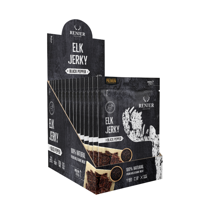 Carnea uscată de elan Elk Jerky este o gustare interesantă, care încântă prin aroma și gustul său deosebit. Acest lucru se obține printr-un proces delicat de uscare și condimente alese, care o transformă într-o adevărată delicatesă. Un alt avantaj este profilul său nutrițional, cu un conținut ridicat de proteine și scăzut de grăsimi. De asemenea, este neperisabilă, fiind o gustare ideală pentru călătorii, școală, cămară sau serviciu.