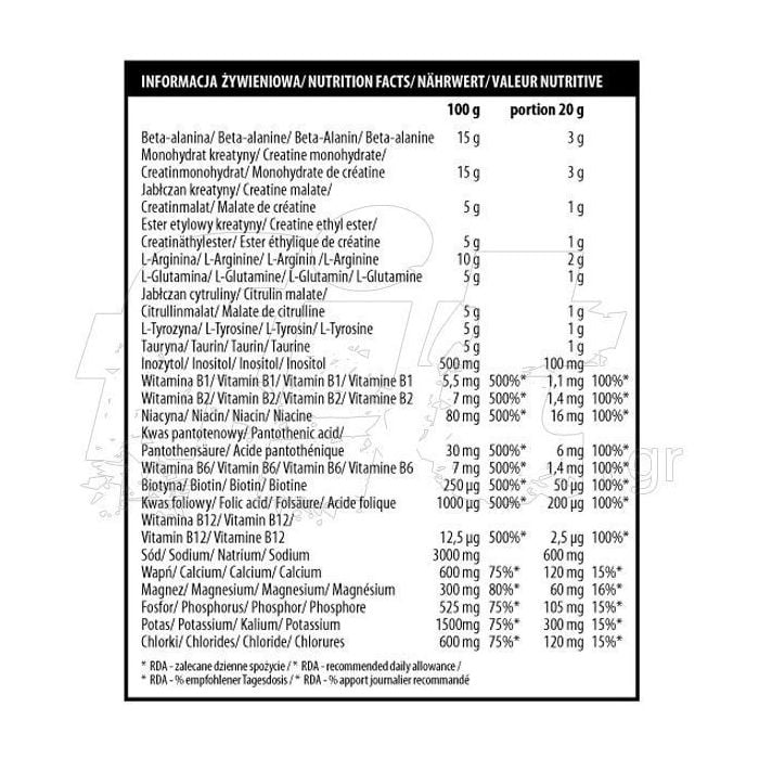 Beta-alanină, creatină monohidrat, corectori de aciditate: acid citric, citrat de sodiu și citrat de potasiu, L-citrulină malat, L-arginină, creatină etil ester, creatină malat, L-glutamină, L-tirozină, taurină, fosfat de calciu, agent anti-aglomerant: dioxid de siliciu, clorură de potasiu, carbonat de magneziu, emulgator: difosfat disodic, arome, inozitol, îndulcitori: aspartam și acesulfam K, vitamine (mononitrat de tiamină, riboflavină, nicotinamidă, D-pantotenat de calciu, clorhidrat de piridoxină, D-biotină, acid folic, cianocobalamină), coloranți: galben chinolină (lămâie și portocaliu), galben apus de soare (grapefruit și portocaliu), roșu cochineal A (grapefruit) - pot avea un efect negativ asupra activității și atenției copiilor.