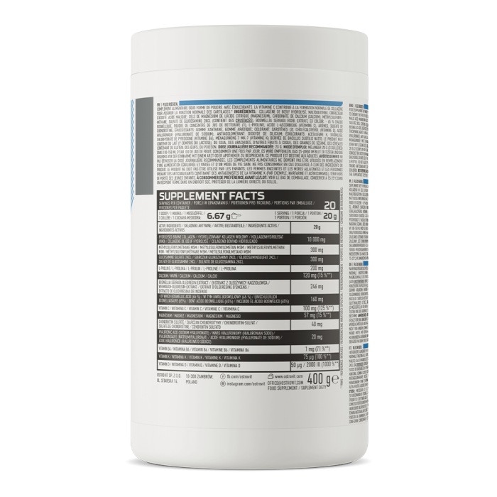Colagen bovin hidrolizat, maltodextrină, regulator de aciditate: acid malic; săruri de magneziu ale acidului citric (magneziu), carbonat de calciu (calciu), metilsulfonilmetan, sulfat de glucozamină 2KCL (conține crustacee), extract de oleorășină de Boswellia serrata Roxb. ex Colebr. - 65 % acid boswellic, L-prolină, acid L-ascorbic (vitamina C), pulbere concentrată de sfeclă roșie, arome, îndulcitor: sucraloză; sulfat de condroitină, agent de îngroșare: gumă de xantan; colorant: (vitamina D), acid hialuronic (hialuronat de sodiu), agent antiaglomerant: dioxid de siliciu; agent de îngroșare: gumă arabică; îndulcitor: acesulfam K; clorhidrat de piridoxină (vitamina B6), menaquinonă-7 MK-7 (vitamina K) din Bacillus subtilis natto. Produsul poate conține lapte (inclusiv lactoză), soia, arahide, alte fructe cu coajă lemnoasă, susan, cereale care conțin gluten, ouă, pește.