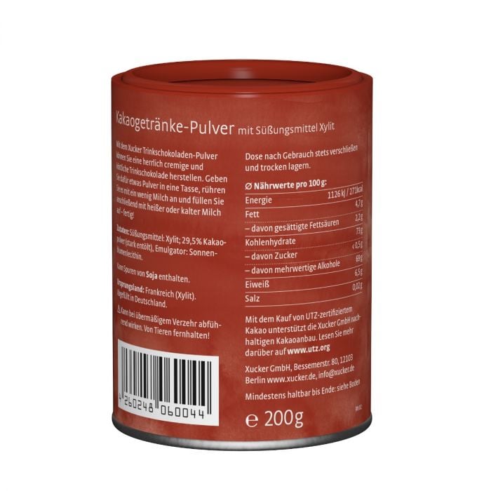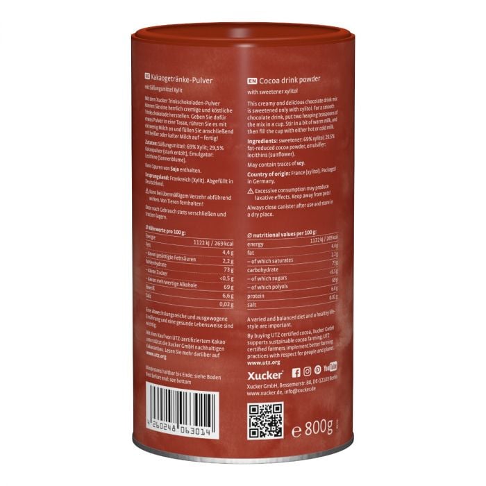 Hot chocolate este o ciocolată cremoasă sub formă de pudră, fără zahăr adăugat. Avantajul său este că nu conține zahăr și este îndulcită cu xylitol. Acesta este un îndulcitor care se găsește în mod natural în fructe sau legume și se adaugă și în guma de mestecat. Comparativ cu zahărul obișnuit, xylitolul conține mai puține calorii. Pregătiți-vă o băutură caldă acasă, care nu conține OMG și care este, de asemenea, potrivită pentru vegani.