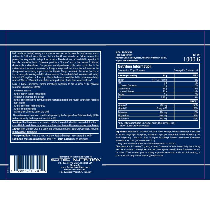 Isotec Endurance este o băutură izotonică pentru sportivi, care hidratează organismul, completand nivelul electroliților. Acesta conține Tri-carb, sursa de energie - dextroza, maltodextrină și fructoză. Datorită lor, se asigură eliberarea treptată de energie și reconstituirea glicogenului în mușchi și ficat. Completează cu electroliții pierduți după transpitație, pentru a rehidrata, și îmbunătățește absorbția și retenția de lichide în organism.