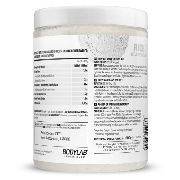 Aportul corect de carbohidrați este important în special pentru atleți și alte persoane cu nevoi crescute de energie. Puteți folosi Laptele praf de orez pentru îmbogățirea băuturii preferate post-antrenament. Îi puteți savura gustul delicios amestecat în apă și vă puteți îmbogăți smoothie-urile preferate sau müsliul. În plus, are o compoziție pură cu 99.8% conținut de orez, 0.2% conținut de sare și un minimum de grăsimi.