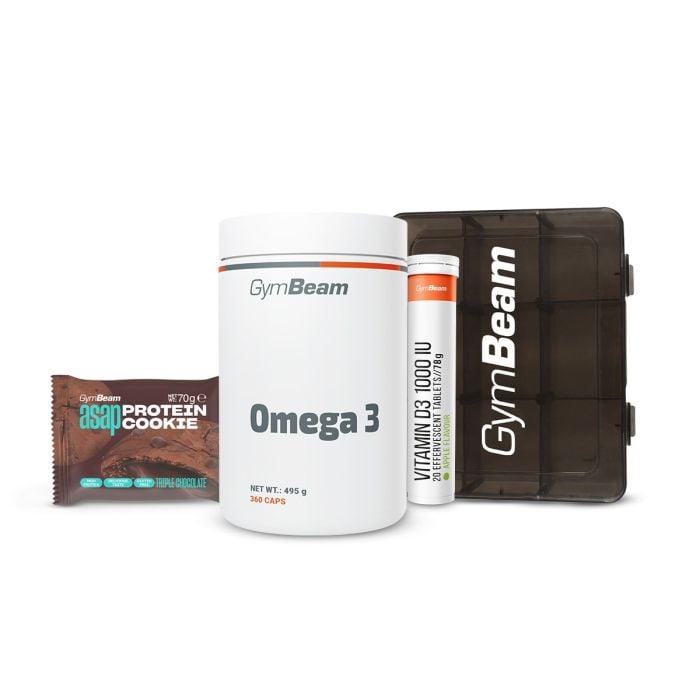 - pachetul de 360 de capsule + cookie proteic, Vitamina D sub formă de tablete efervescente și o cutie practică pentru tablete și capsule.
