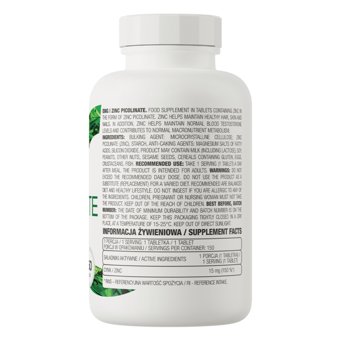 Picolinatul de zinc sunt tablete ce conțin zinc sub formă de picolinat. Acesta contribuie la fertilitate, la funcția reproductivă adecvată, la nivelurile optime de testosteron și la sinteza adecvată a ADN-ului. De asemenea, zincul este benefic pentru funcționarea imunității și pentru protecția celulelor împotriva stresului oxidativ.