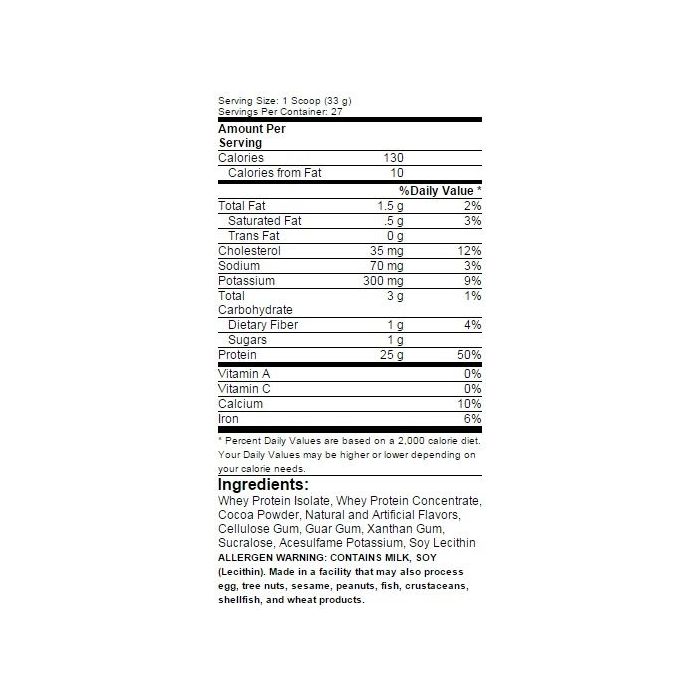 Izolat proteic din zer, concentrat de proteine din zer, cacao pudră, arome naturale și artificiale, gumă de celuloză, gumă guar, gumă xantan, sucraloză, acesulfam de potasiu, lecitină din soia.