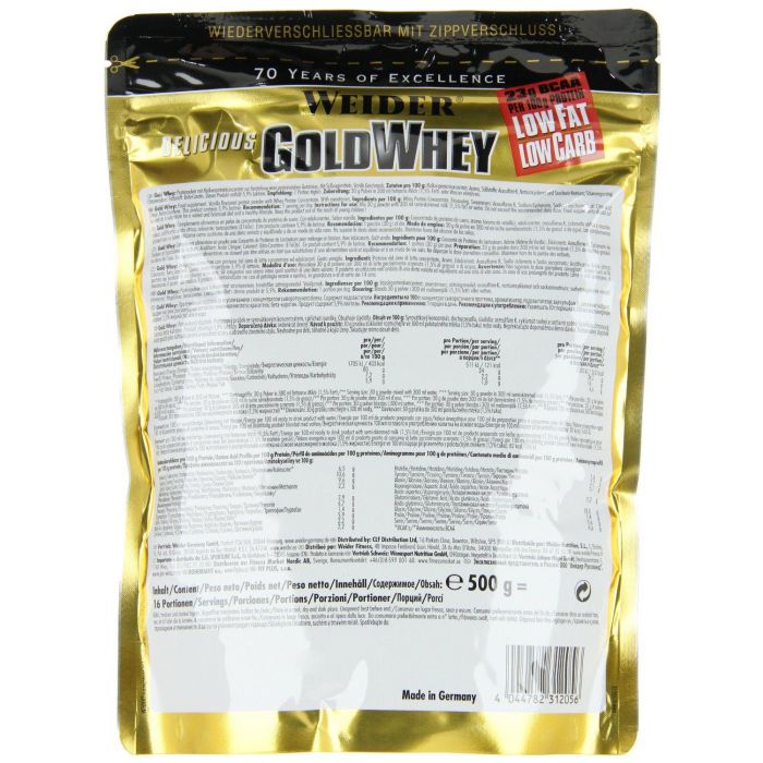 Gold Whey Protein este un concentrat proteic din zer ultrafiltrat, care asigură un BCAA ridicat, de până la 23 g la 100 g de proteine. Proteina are o concentrație de 80% de proteine, cu carbohidrați și grăsimi minime, care nu conțin aspartam și conține ingrediente bioactive, cum ar fi alfa și beta-lactoglobulina, reducând aciditatea organismului. Acestea asigură ușurința de recuperare și de adaptare a organismului la stres, plus imunoglobuline care sprijină sistemul imunitar și limita Glicomacropeptidă a apetitului.