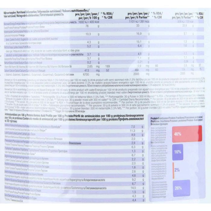 70% concentrat din zer, 20% izolat din zer, 6,7% L-glutamină, aromă, culoare: roșu betaină, îndulcitori (ciclamat de sodiu, acesulfam K, zaharină sodică), carbonat de calciu, vitamina B6.