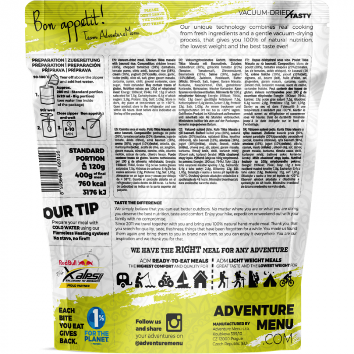 Puiul Tikka Masala cu orez basmati este o delicatesă indiană populară, potrivită pentru călătorii. Mâncarea este pregătită mai întâi în mod tradițional, folosind doar ingrediente de calitate. Apoi este timpul pentru tehnologia unică de uscare Vaccum-Dried Tasty®. Aceasta asigură că mâncarea își păstrează aroma delicioasă și valoarea nutrițională. Utilizarea acestei tehnologii reduce cu până la 80% din greutate. Produsul final este apoi ambalat în pungi practice vidate, astfel încât să nu transportați aer suplimentar cu voi. La urma urmei, nu sunteți aici pentru a cumpăra aer. Rezultatul este o mâncare ușoară, pe care o puteți consuma în principal în deplasare. Acest lucru vă va fi util dacă doriți să împachetați alimente nutritive pentru călătorii, dar doriți să economisiți spațiu în același timp, deoarece fiecare gram pe care îl cărați în spate contează. Este ideală pentru drumeții montane, camping sau excursii cu bicicleta. Mai mult, vă puteți bucura de ea și acasă când, pur și simplu, nu aveți timp să gătiți.
