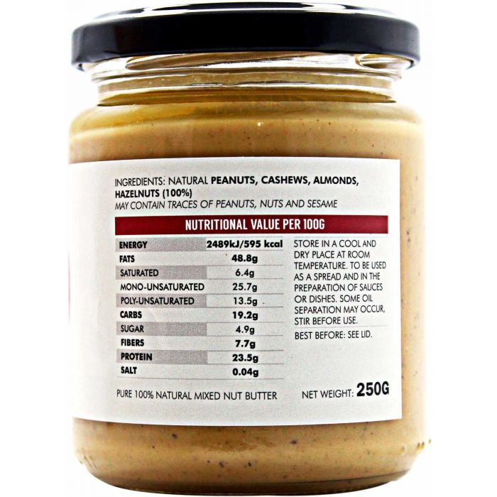 Pure Mixed Nut Butter este un unt din nuci 100% natural şi pur, ce conţine un amestec de arahide, nuci caju, migdale şi alune. Acestea garantează un gust bogat şi efect crocant şi în plus oferă inimii dvs grăsimi benefice, doză de proteine şi vitamine. Îl puteţi utiliza ca şi unt pentru pâine; înviorează gustul cașului de ovăz, contribuie la o consistenţă cremoasă a smoothie-ului şi budincii şi reduce apetitul pentru dulciuri nesănătoase.