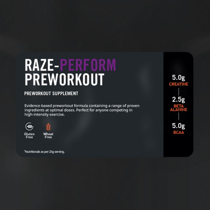 Raze-Perform™ conține cofeină pentru a vă stimula și creatină care ajută la creșterea performanței în timpul intervalelor scurte de antrenament