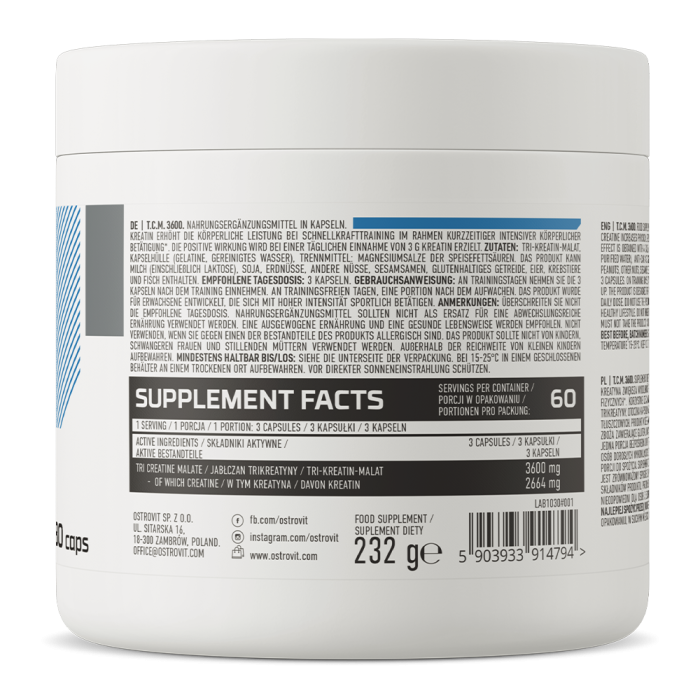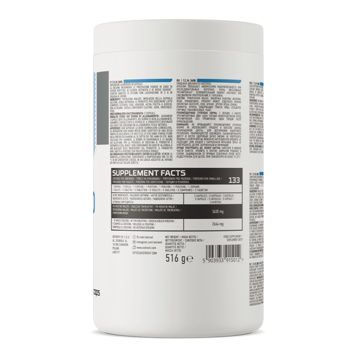 Tri-Creatină Malat T.C.M. sunt capsule cu o cantitate funcțională de tri-creatină malat. Această combinație de creatină și acid malic în proporție de 1:3 crește solubilitatea, astfel încât să puteți profita la maximum de supliment. Acesta este și motivul pentru care sportivii de forță, jucătorii din sporturile de echipă, unde explozivitatea este importantă, sau fanii HIIT se concentrează pe suplimentarea acestuia. Creatina este capabilă să sporească performanța în intervale scurte consecutive de antrenament intens. Pentru a beneficia de aceasta, este necesar să suplimentați zilnic minim 3 g creatină, lucru posibil cu ajutorul T.C.M. Cu toate acestea, sarea acidului malic joacă, de asemenea, un rol important, deoarece poate ajuta la descompunerea acidului lactic, care este asociată cu o reducere a intensității exercițiilor fizice.