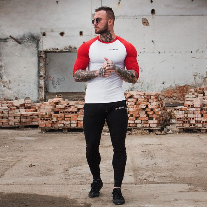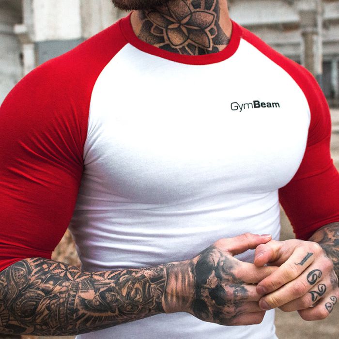 Tricoul cu mâneci în stil de baseball Fitted Sleeve este un tricou simplu de culoare alb-roșu, cu mâneci trei sferturi și are inscripția cu litere mici "GymBeam". Este ușor mulat pe corp și vă pune în evidență mușchii de atlet. Tricoul poate fi purtat în sala de sport sau în ținuta casual.